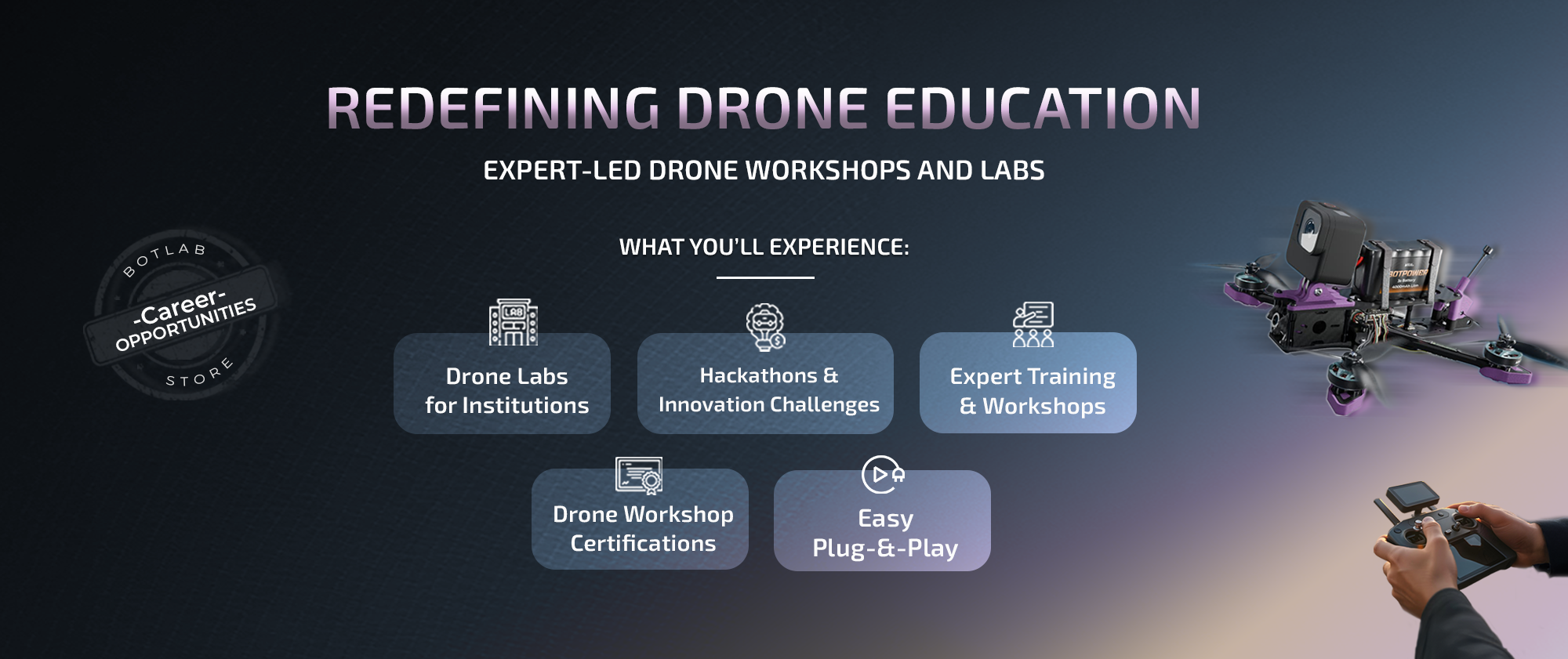Collaborate with BotLab in providing students with high-standard, industry-level, on-site drone training. Put them in a position to get the necessary skills through practice, real hardware exposure, and a clear understanding of one of the most significant emerging technologies in India.