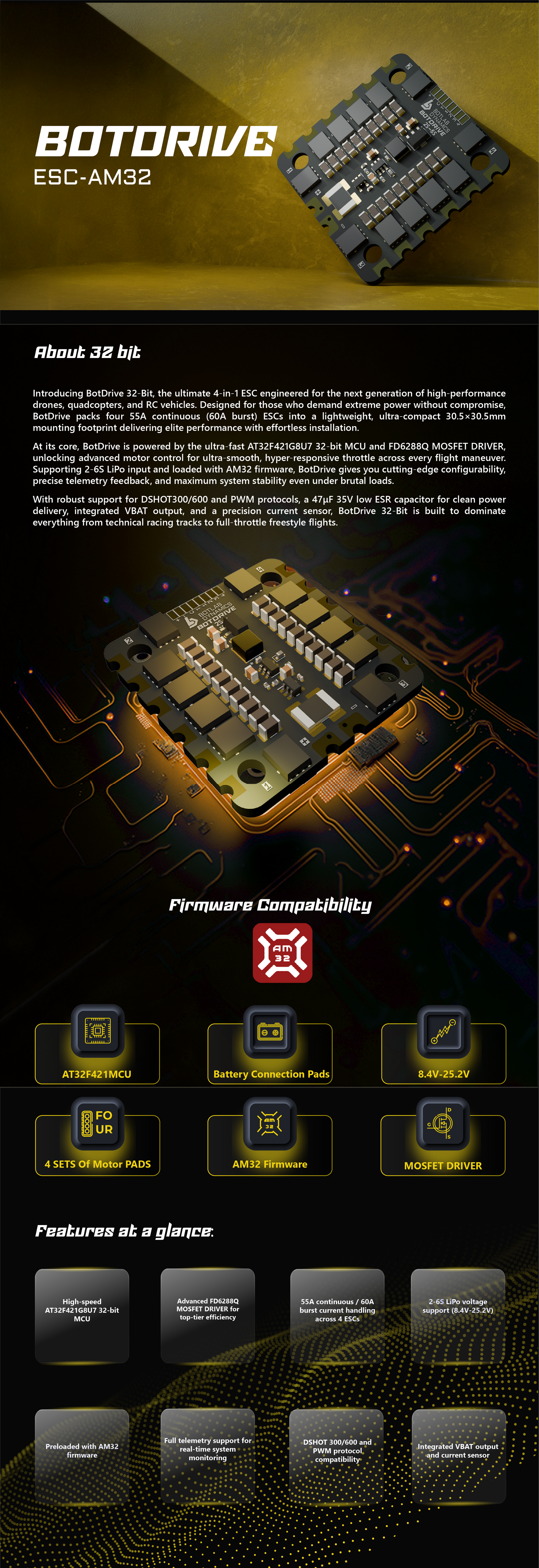The BotDrive 55A AM32 4-in-1 ESC has AM32 firmware for smooth and precise motor control.