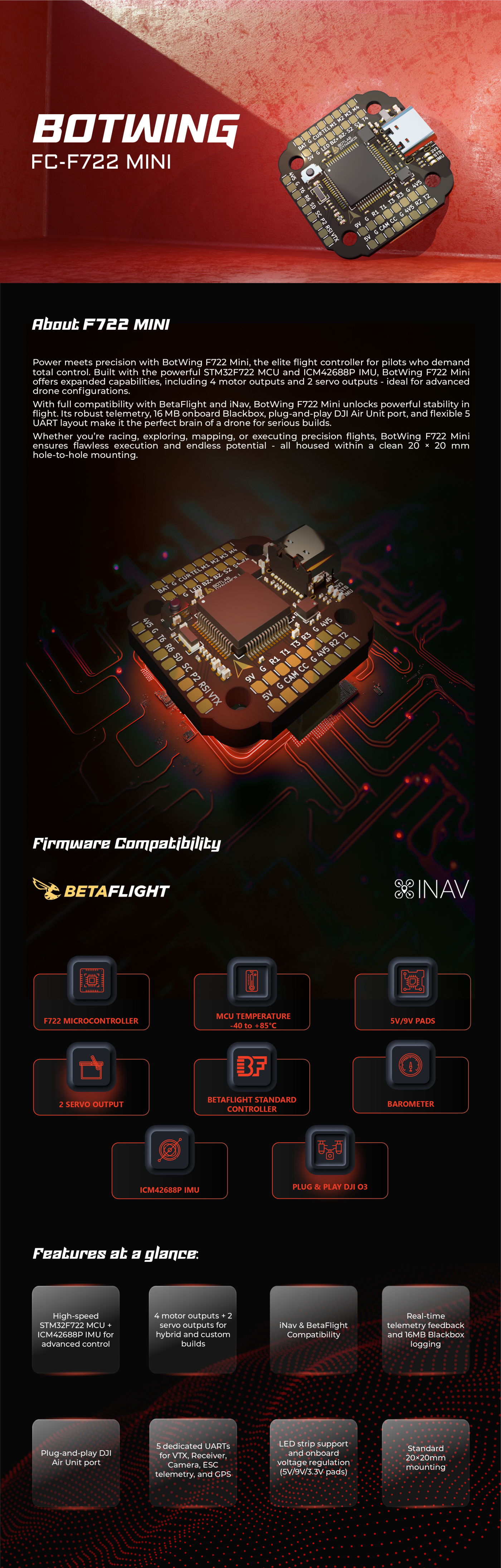 The F722 Mini Flight Controller is a high-performance F7 flight controller designed for precision, flexibility, and reliable performance in every drone build.